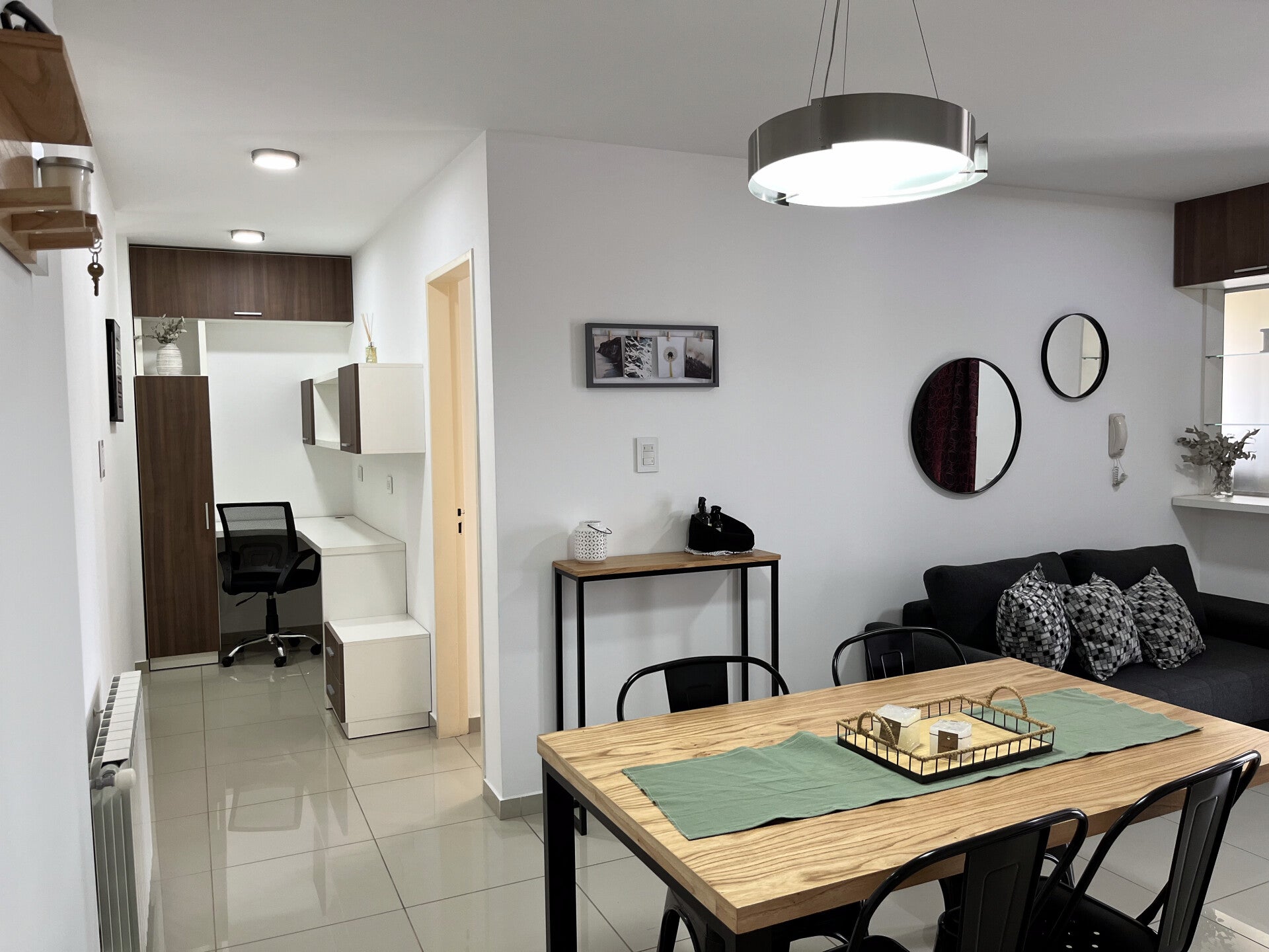 Este departamento de un dormitorio es luminoso y moderno, con grandes ventanales que permiten la entrada de luz natural en todas las áreas del departamento. La sala de estar cuenta con un sofá que se convierten en cama, mesa de comedor y un
